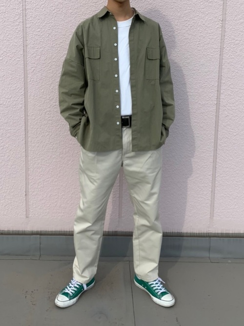 カーキ×白×黒の定番配色も、モードなアイテムを使うと上級者っぽく見えますね。シャツのボタンは一番上まで留めると、きちんと感がアップします。