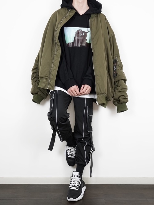 ミリタリーブルゾンのなかでもMA-1は、定番人気ですよね。こちらは、シンプルなデザインなので、ワイルドになりすぎず、どんなコーディネートにもマッチしやすいアイテムです。リバーシブル仕様になっており、カーキと黒のブルゾンを一枚で楽しめるのも嬉しいポイントです。