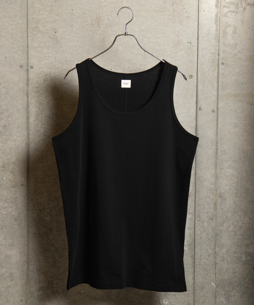 毛羽の少ない糸を使用し、高品質なテレコ編みの素材を使用したプレミアムなタンクトップです。着用によってできる毛羽や毛玉を防ぐので、心地よい肌触りを長く楽しむことができます。裾はややロング丈ですが、重ね着をしてもおしゃれにキマるデザインで着回しがしやすいのも特徴です。