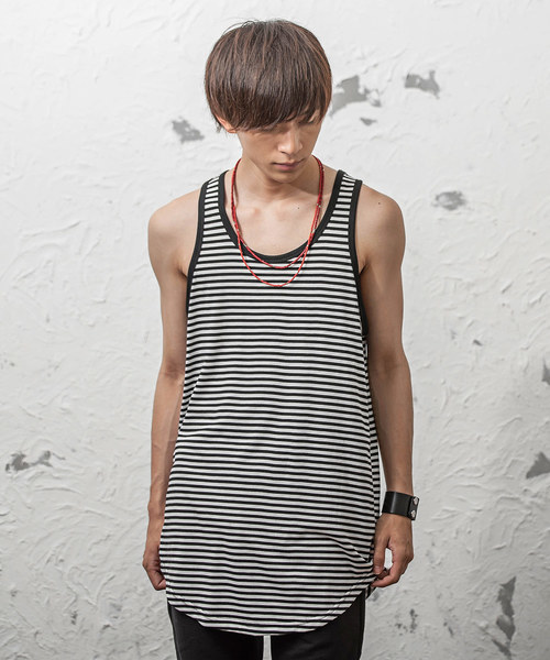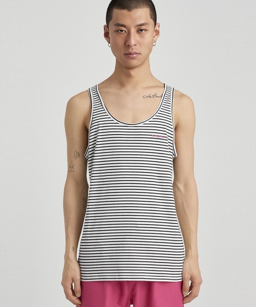 パネルリブを使用したミラーのタンクトップ。伸縮性や速乾性など機能性に優れており、トップスとしてはもちろん、インナーとしても使いやすいでしょう。ボーダー柄は1枚でコーデのアクセントとして使えるので、タンクトップを使用したアメカジファッションをする際にはぜひ取り入れたいアイテムです。