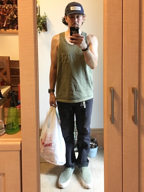 胸ポケットのついたカジュアルなタンクトップにロングパンツを合わせたコーデ。タンクトップはショートパンツとの相性が抜群ですが、ロングパンツと合わせると落ち着いた印象の着こなしになります。キャップやスリッポンも含めて全体をダークトーンでまとめることで、違和感のないおしゃれなスタイルに仕上がっています。