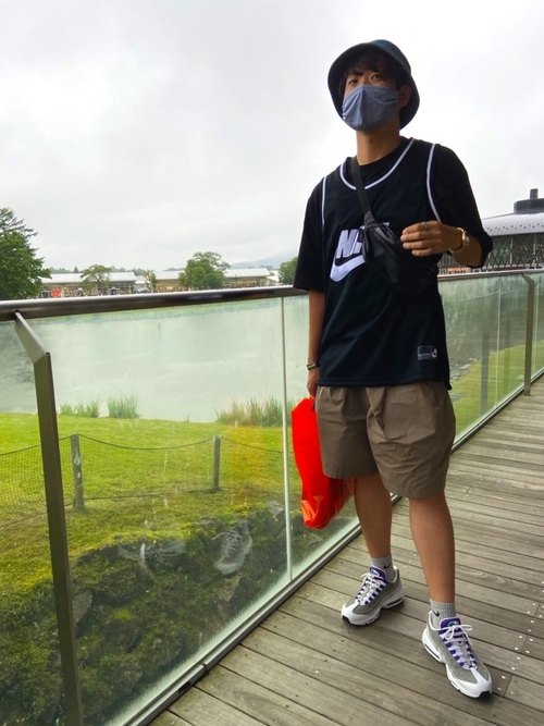 ナイキのタンクトップと半袖Tシャツを組み合わせた、スポーティーカジュアルな着こなしです。タンクトップとレイヤードするアイテムは、同じ色で統一することですっきりとまとまります。ボトムスには膝丈のショートパンツ、足元は靴下を合わせたスニーカーで整った印象のコーデが完成しています。
