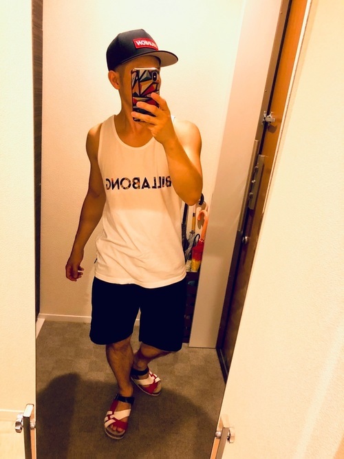 ビラボンのタンクトップとキャップを合わせたコーデ。白と黒を組み合わせてスタイリッシュなコーデに仕上がっています。また、キャップとサンダルは同じ色合いのものをチョイスすることで、まとまった印象の着こなしに。爽やかでスポーティーな夏におすすめのスタイルです。