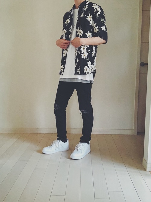 インナーにタンクトップを使ったレイヤードコーデ。タンクトップと半袖Tシャツの裾をバランスよく見せて、花柄のシャツをアクセントに羽織り、きれいめなコーデに仕上がっています。ボトムスにスリムパンツを合わせることで全体がすっきりとし、白色のスニーカーで爽やかさをプラス。
