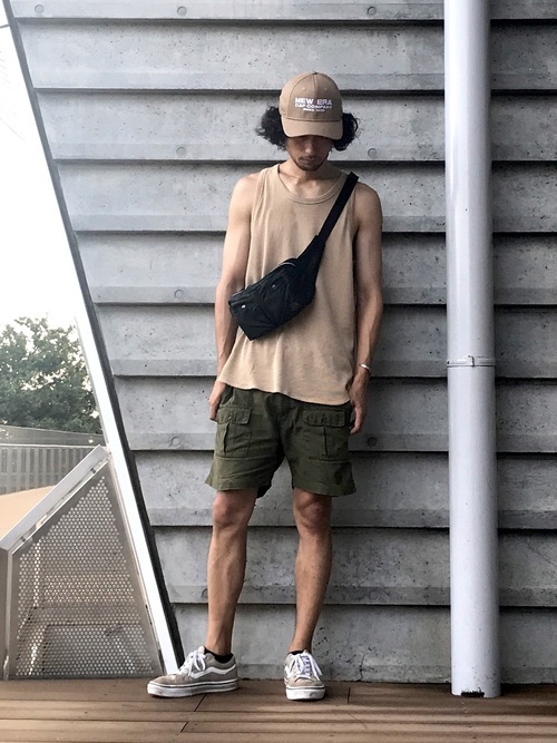キャップやタンクトップ、スニーカーはベージュで揃え、ショートパンツはカーキというアースカラーを使ったナチュラルなコーデ。アースカラーで全体をまとめることで落ち着きのある大人の着こなしになります。足元は靴下を合わせてきちんとした印象を出し、ラフになりすぎないように細かいところにもこだわったコーデです。