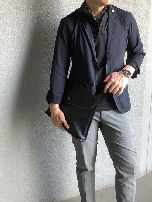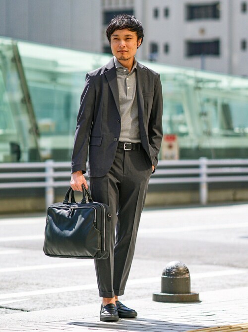 ポロシャツとパンツ、またスリッポンをダークトーンでまとめたコーデは普通、シャープで知的な雰囲気に仕上げます。しかし明るめグレーのジャケットを上着として重ね着するだけで、一気に温かみがプラスされるのです。上品で洗練された都会的イメージに仕上がりつつ、親しみやすさもあるのでセミフォーマルなシーンにも着こなし可能です。
