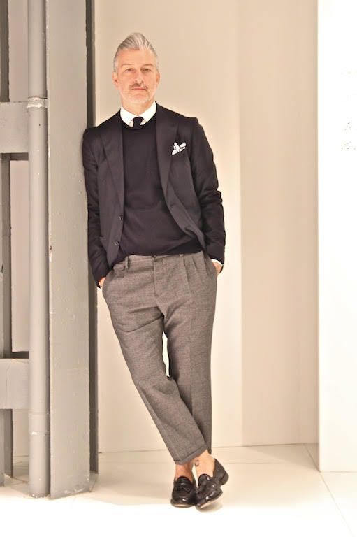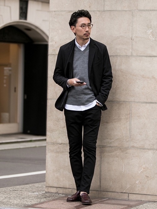 フォーマルシーンでのジャケットのインナーは清潔感ときちんと感を出せるものをセレクトします。白シャツがスタンダードですが、状況によって黒シャツなどドレッシーなものをチョイスしても。寒い時期ならハイゲージのニットを合わせてもきれいにキマります。