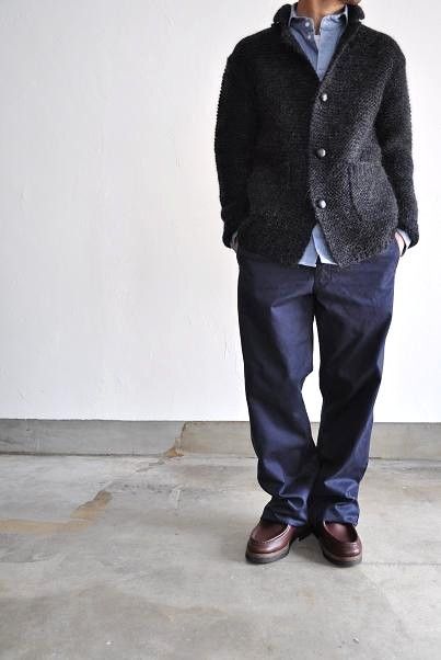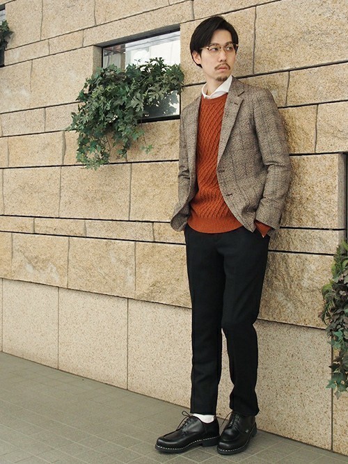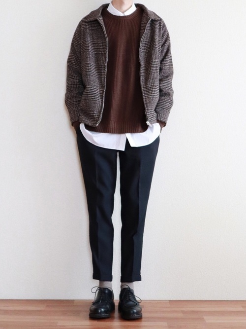 温かいカラーのニット×温かい素材のジャケットは冬ならでは。カジュアルに寄っているトップスをボトムズのセンタープレスパンツがきれいめに引き戻します。インナーのシャツも映える、大人っぽく落ち着いたメンズコーデです。