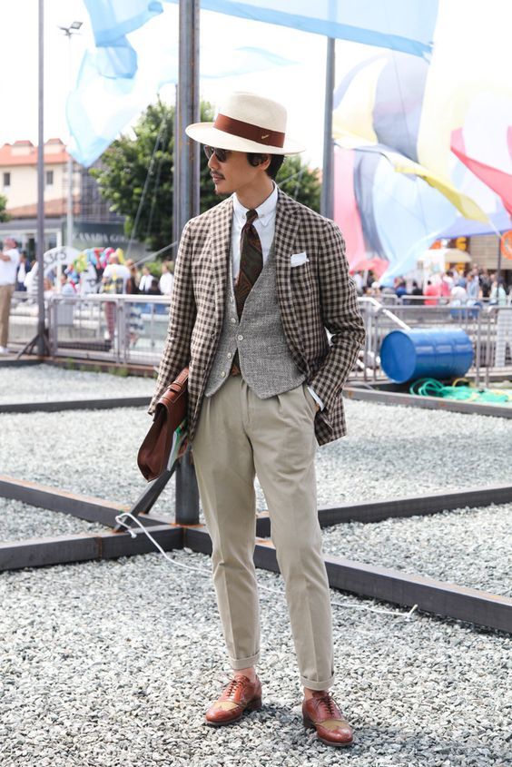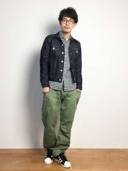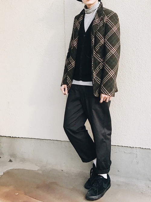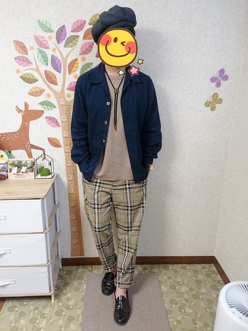 ジャケットのインナーはアースカラーのシンプルなシャツをセレクト。その分、ボトムスはチェックアイテムを選んで遊び心満載な着こなしです。帽子を変えればまた違った雰囲気も楽しめる可塑性のあるコーデです。