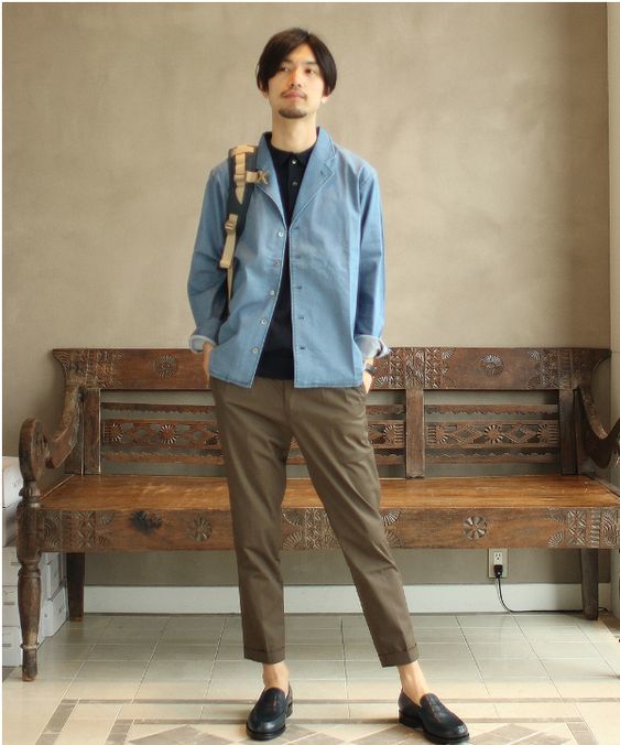 ジャケットに合わせたブルーのポロシャツはよく見るとカモフラ柄になっています。奥行きを作り出すことができるので、一気におしゃれに見えるアイテムであるカモフラ柄は持っておいて損はありません。こちらのようにシンプルなジャケットと合わせるのがコツです。