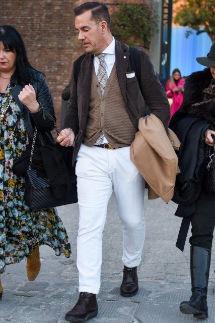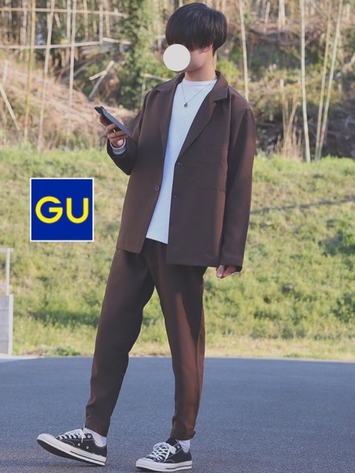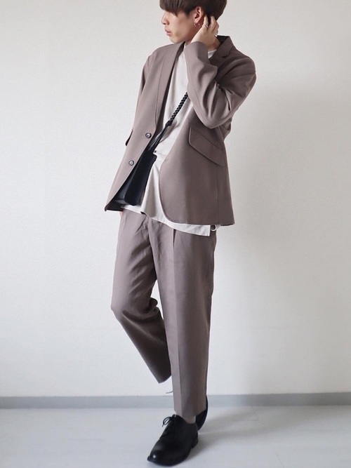 ブラウンのセットアップには白のインナーで軽やかさを。春先のまだ少し肌寒い時期にぴったりのメンズコーデです。足元はスニーカーでカジュアルダウンしているので街着にも最適。