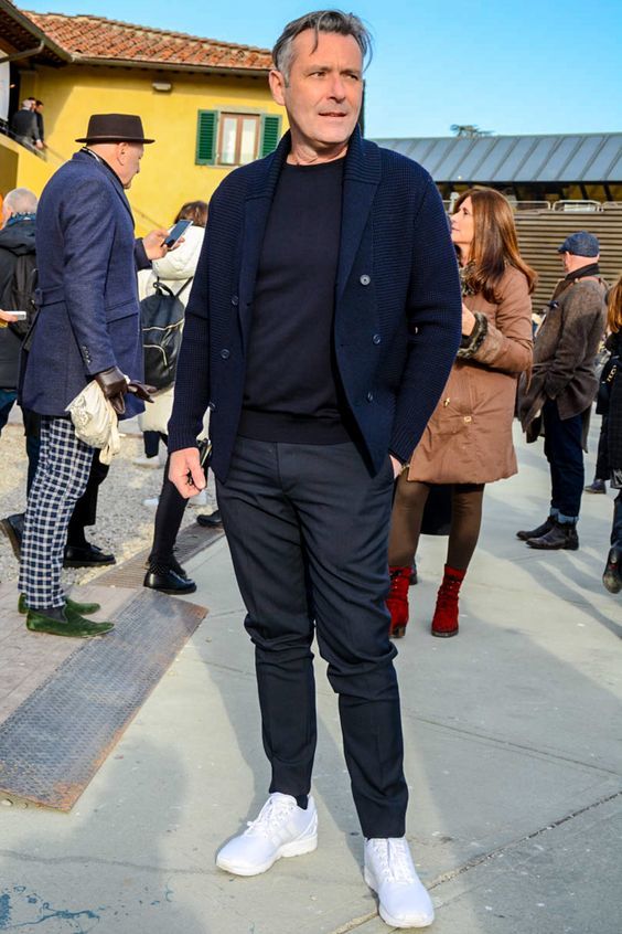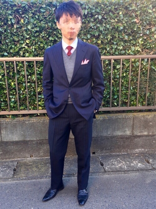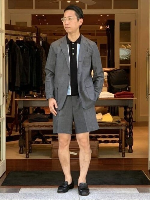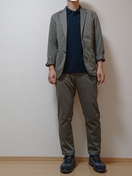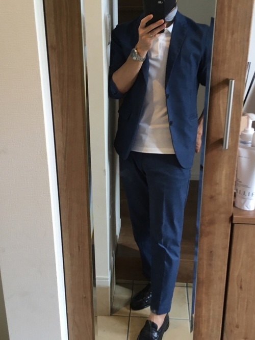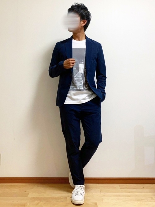 セットアップのインナーにこちらはネイビーのポロシャツをセレクト。男性っぽさと大人っぽさを強調できる着こなしです。このままビジネスカジュアルとして通勤しても良いでしょう。