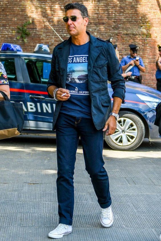プリントTシャツをタックインしてジャケットとあわせれば海外セレブのような印象に。腕まくりをして夏の抜け感も出した上品なメンズコーデです。