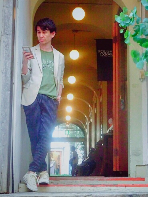 淡いカラーが特徴のプリント半袖Tシャツをインナーに、淡いカラーのジャケットをアウターにしているため全体が優しい雰囲気でまとまっています。ストライプのパンツと合わせ、どこか大人の余裕を感じさせる着こなしです。
