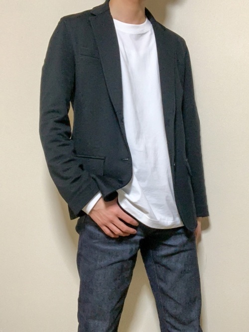 白シャツにはこちらのように暗めのカラーのジャケットが似合います。トップスをきれい目にキメているので、ボトムスはジーンズでカジュアルダウン。ジャケットの丈感とインナーの丈感がぴったりなバランスのよい着こなしです。プチプラでノームコアなアイテムで大人の雰囲気を出しましょう。