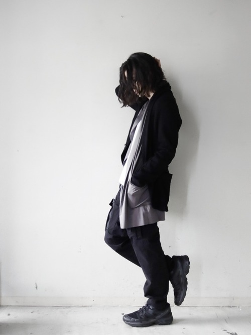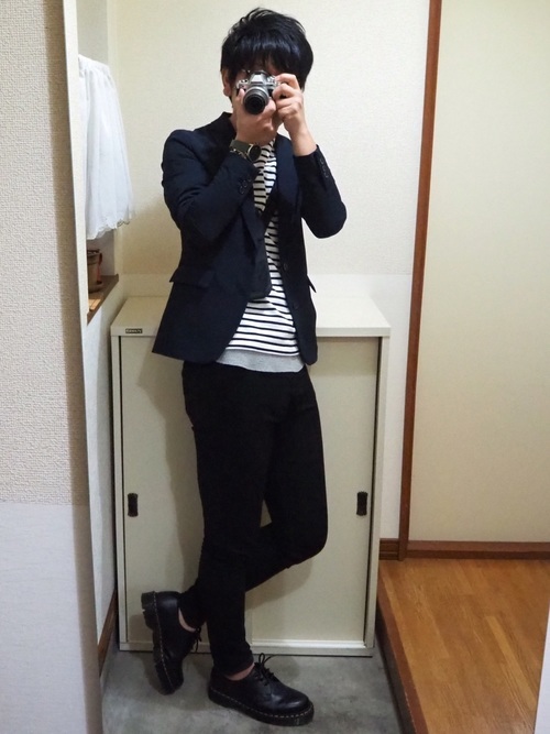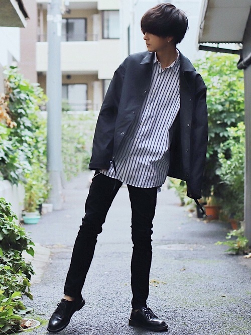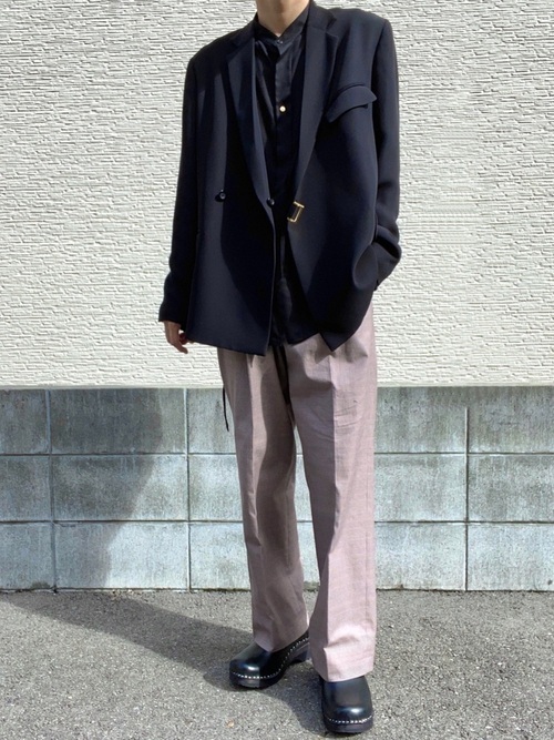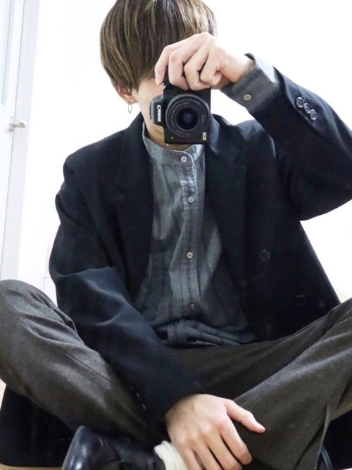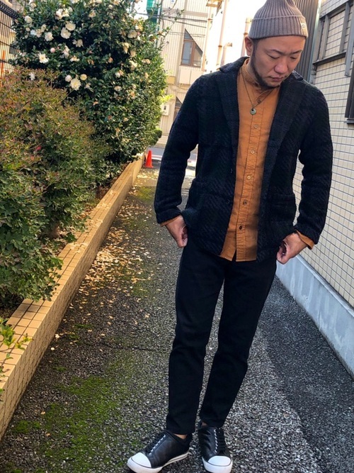 トレンドのバンドカラーシャツをジャケットと合わせたコーデ。ニットキャップとインナーのカラーが秋の雰囲気を感じさせます。全体を黒でまとめつつも遊び心を忘れない大人の余裕を感じさせる着こなしです。