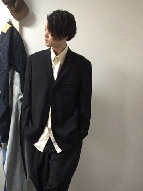きれいめなスタンドカラーの白シャツをブラック系のスーツで包んだスタイルは結婚式の二次会などパーティシーンにもぴったり。シャツの裾をあえて出すとけだるい雰囲気に拍車がかかります。また裾を出すことにより、黒一色のコーデにリズムがつき、程よい抜け感が表現できます。