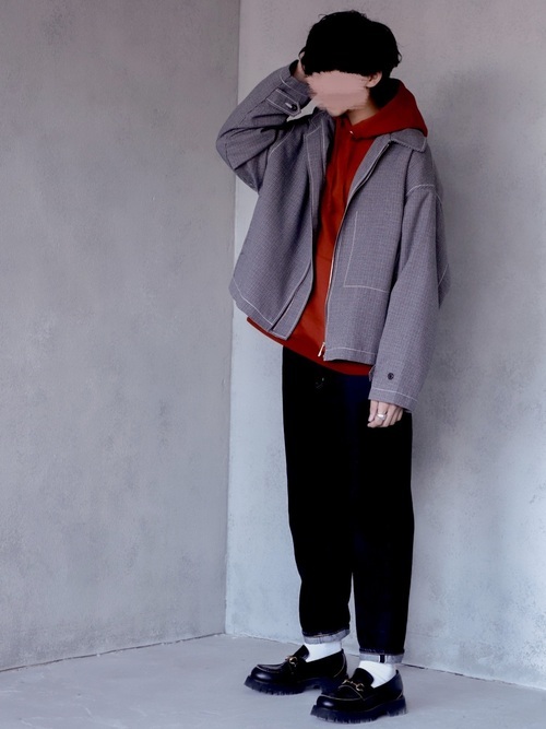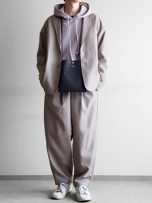 パーカーは子供っぽく見えてしまいがちなアイテム。しかしこちらのように同系色のパーカーをジャケットと合わせたスタイルは大人っぽくきれいめに決まります。太目のボトムスで雰囲気を作ったおしゃれ上級者のメンズコーデです。