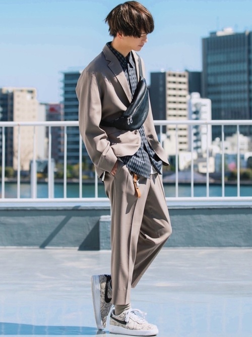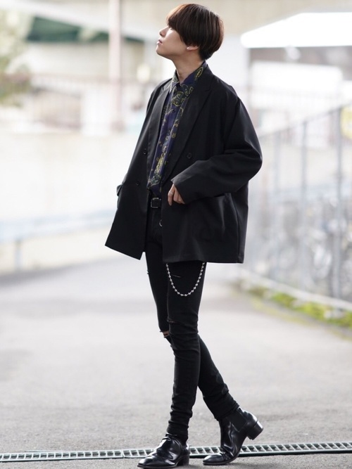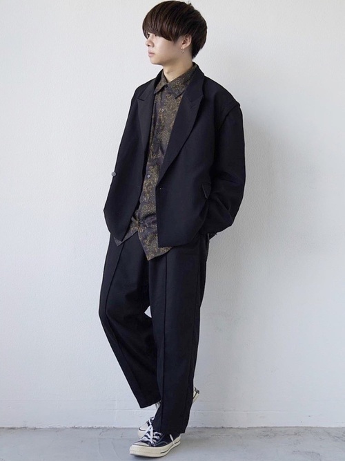 柄シャツは単体で着ると野暮ったくなってしまう為、こちらのようにジャケットと合わせるのが正解です。シルエットの大き目なジャケット&パンツで全体的にストリート感のあるメンズコーデに仕上がっています。