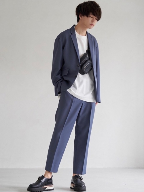 カラーのカットソーもジャケットのインナーとしておすすめです。着こなしのポイントは、ジャケットよりも明るめのカラーをセレクトすること。暗めのものを選ぶとジャケットやボトムスとのバランスがかなり取りにくくなります。ブルーや明るめネイビー、グレーなどが合わせやすいのでおすすめです。