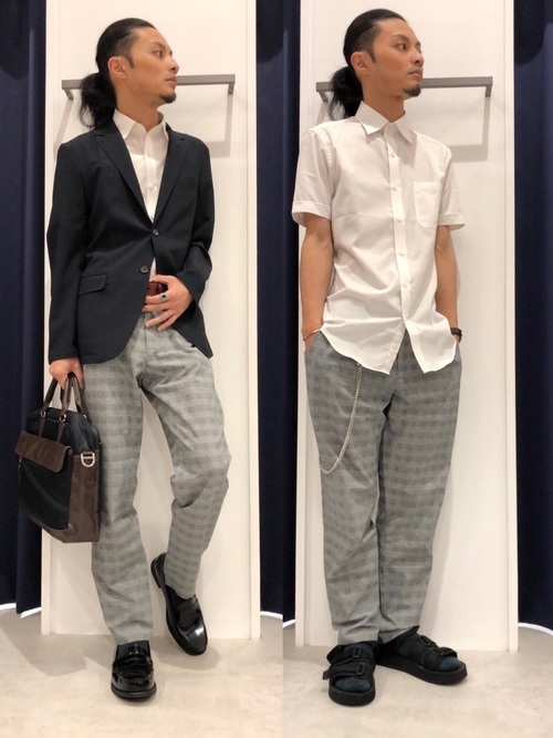 夏といえば半袖シャツ!ジャケットと合わせれば通勤やビジネスでも使えるスタイルになります。オンとオフの切り替えができるメンズコーデでもあります。