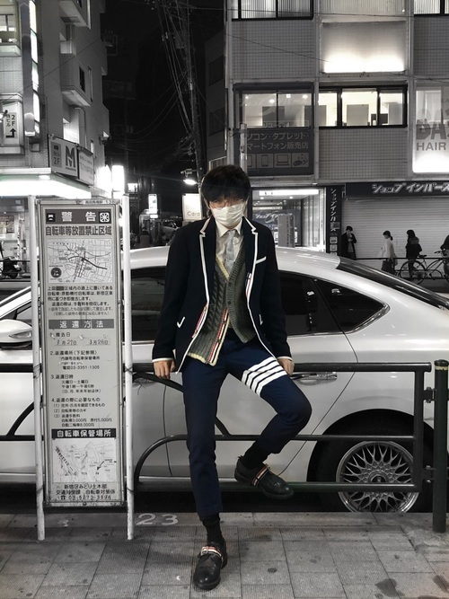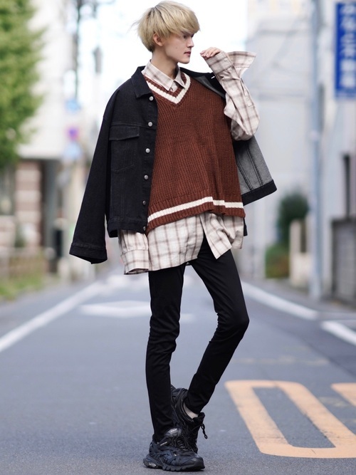 柄シャツとニットベストをあわせて思い切りプレッピーにまとめたメンズコーデ。若い世代におすすめの10代から20代に人気の着こなしです。トップスにボリュームがある分ボトムスは細身アイテムでまとめてバランスをとっています。