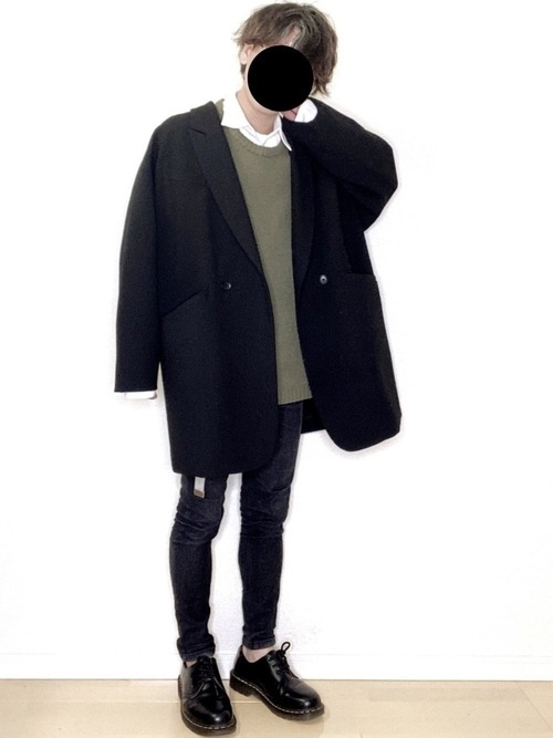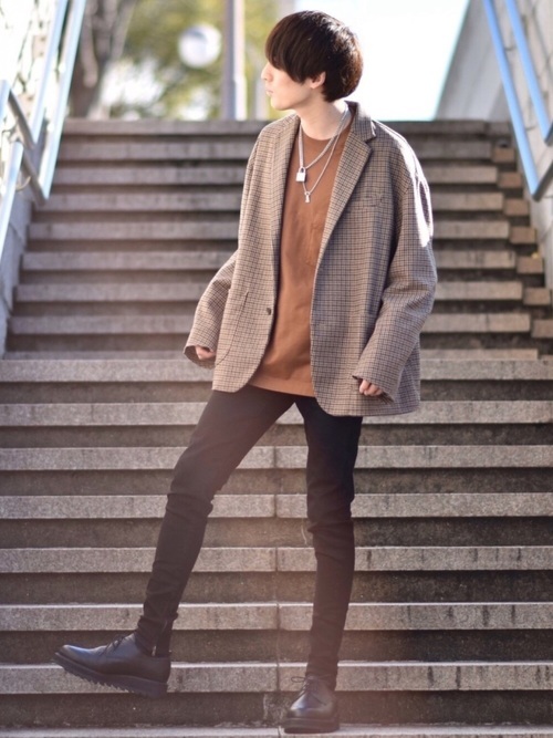 冬のジャケットスタイルのインナーにカットソーを選ぶなら機能性アイテムを足すのがマスト。また、こちらトップスをブラウン系、ボトムスはブラック系としっかり分けてコーデを作り上げています。オーバーサイズ感のあるジャケットがおしゃれなメンズコーデです。