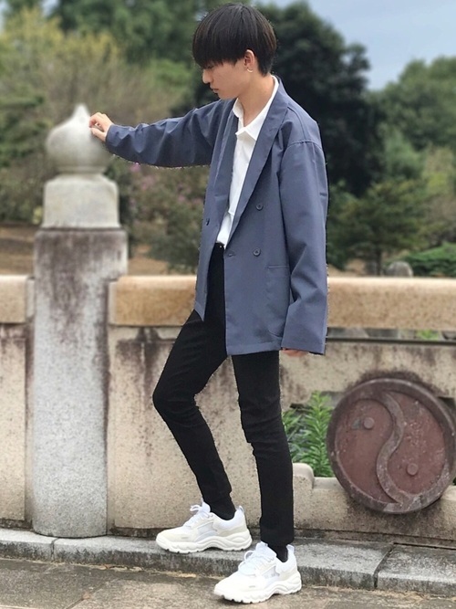 トレンドのスモーキーカラーのジャケットを使った白シャツコーデです。ボトムスを細身の黒スキニーにすることでおしゃれに見せるのがポイント。足元はシャツと合わせたカラーの靴で、全体を調和させた着こなしです。