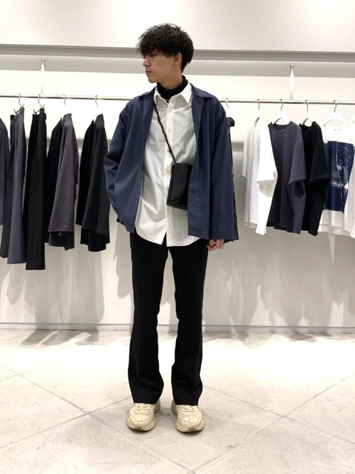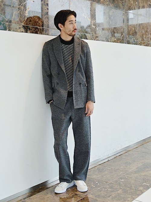 大き目のシルエットが特徴のジャケット。インナーにはブラウンのダマスク柄シャツを合わせています。少し洒脱になりすぎるので、足元はスニーカーでカジュアルダウン。バランスの取れた着こなしです。