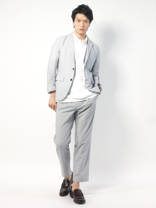 白のポロシャツと明るめのブルー系セットアップの組み合わせは爽やかで清潔感のある印象になります。上品な印象にもなるので女子ウケも良好。こちらは腕まくりをしていますが、程よい抜け感が出ています。