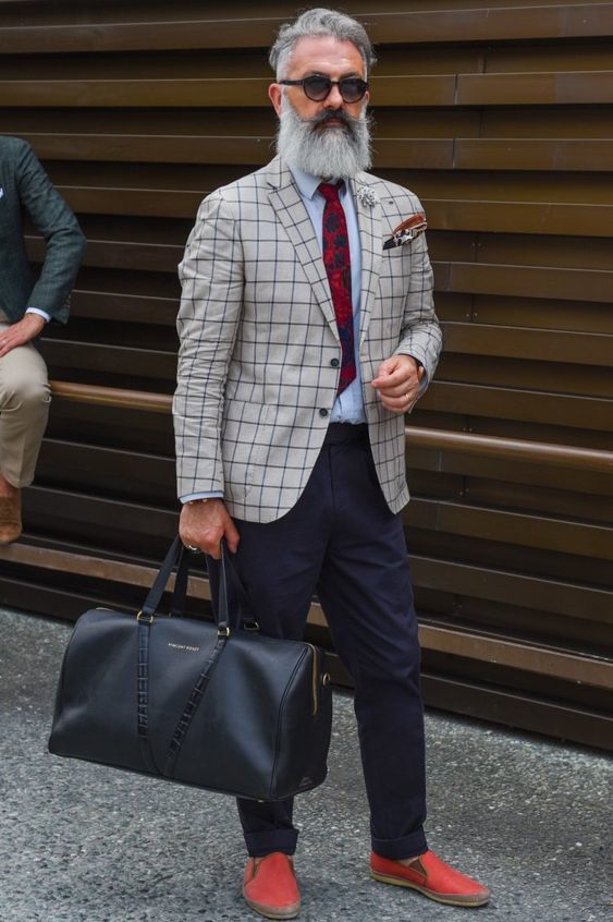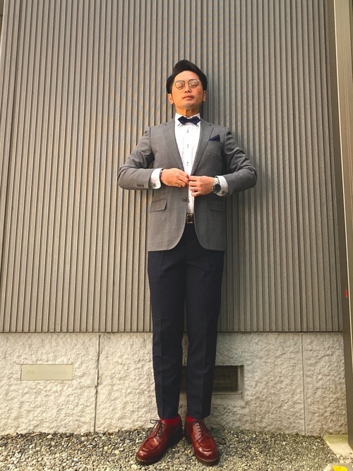 クラシックなデザインのウィンドーペン柄がお洒落なジャケットとネイビーパンツを合わせたコーデです。首元には黒の蝶ネクタイを合わせてお洒落上級者の装いになっています。ジャケットとパンツの落ち着いた色味から一転、足元の差し色がアクセントになっているのは真似したいポイントです。