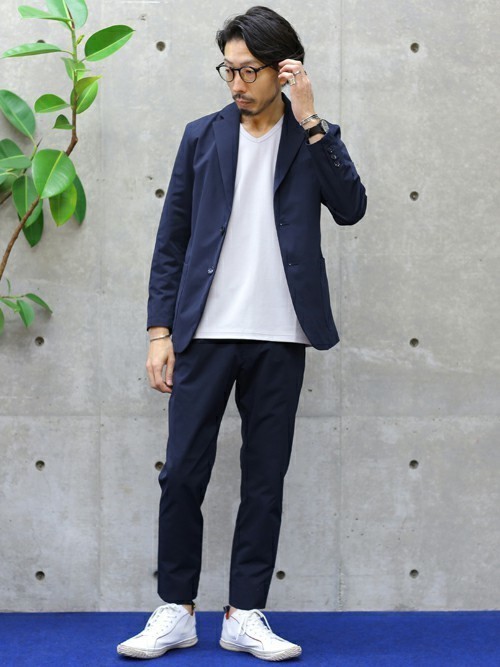 ネイビー×ネイビーでシックにまとめたジャケパンコーデです。インナーとシューズはホワイトでまとめて、爽やかで統一感のある色選びがセンスの良さを感じさせます。インナーとして取り入れた無地のTシャツが清潔感あるコーデ作りに一役買っているのも見逃せないポイントです。