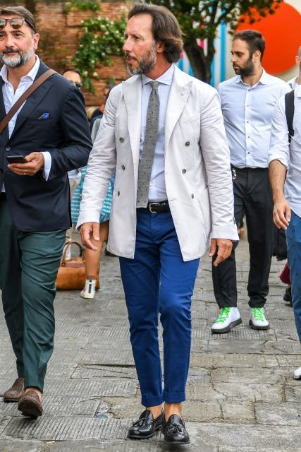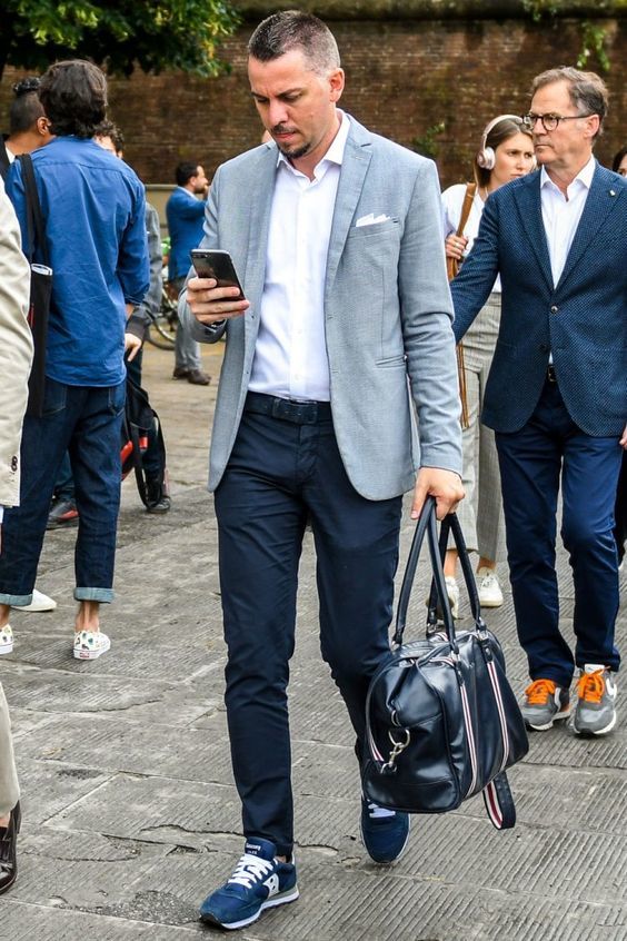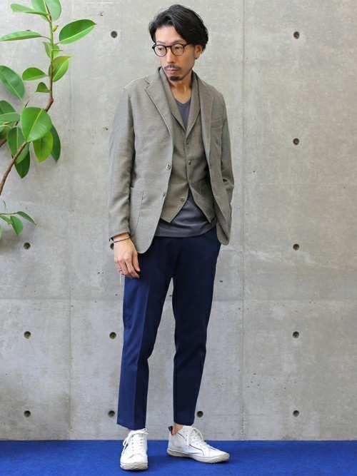 ネイビーパンツとグレーのジャケット&ジレを合わせたコーデは大人の余裕を感じさせます。インナーには相性の良い寒色のVネックTシャツを採用した、全体的にまとまりのあるコーデです。足元はホワイトのスニーカーでメリハリをつけているのがポイント。