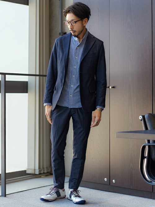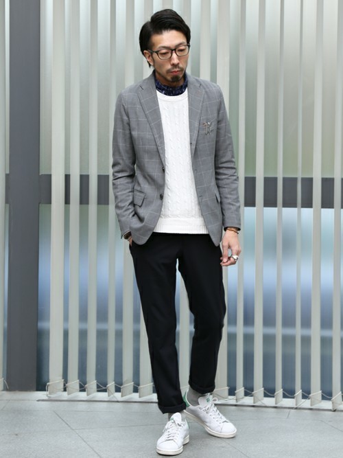 ネイビーのパンツにグレーのジャケットという定番の組み合わせですが、インナーにチェック柄シャツ&ニットを採用してこなれ感のある着こなしです。ニットとスニーカーの色を合わせることでコーデ全体にまとまりが出ています。