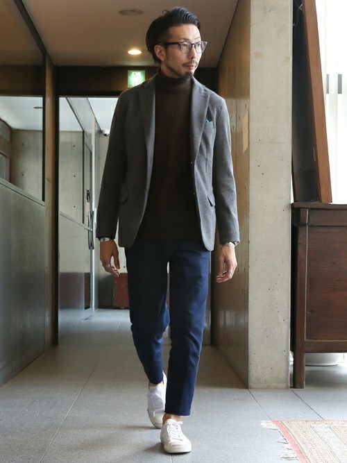 ジャケットにタートルニットを合わせたコーデは秋冬にぴったりです。ネイビー×ブラウン×グレーの相性は抜群で、足元のホワイトがコーデを暗い印象にしない大事な役割を果たしています。もちろんビジネスシーンでは全体を暗い色でまとめて落ち着いた雰囲気を出すのもアリです。