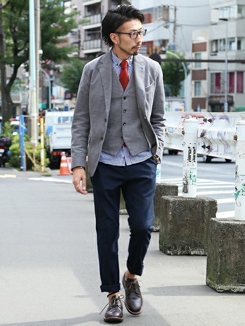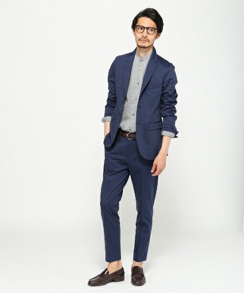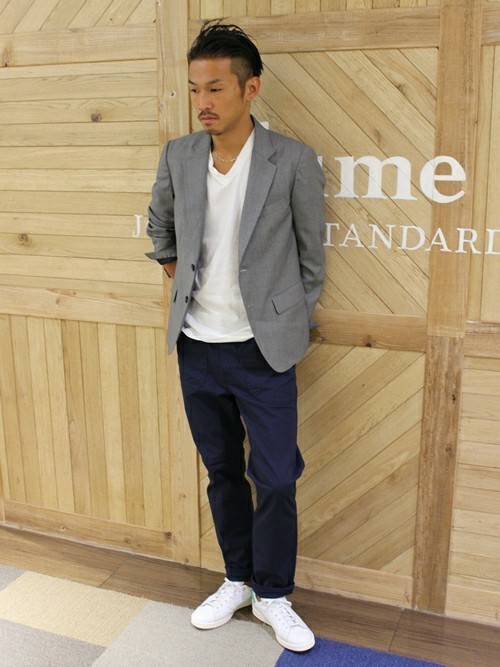 ネイビーパンツとグレーのジャケットの組み合わせに、ゆったりめのカットソーとTシャツでラフに仕上げたジャケパンコーデ。程よい抜け感がポイントです。ジャケットの袖をロールアップしておくとよりカジュアルな雰囲気に仕上がります。