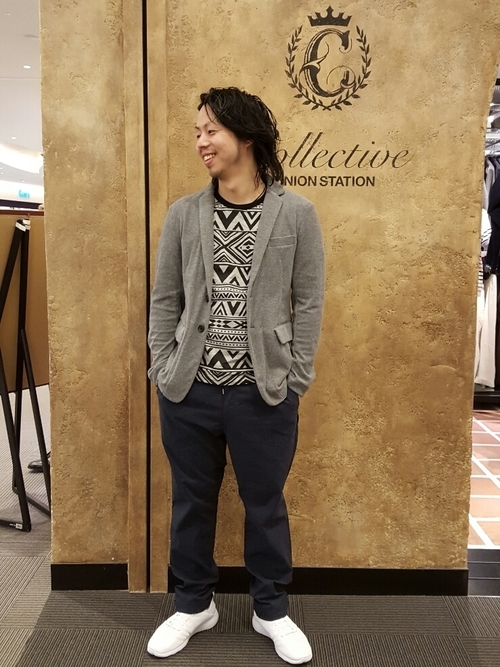 ネイビーパンツにグレーのジャケットを合わせたコーデの中で、幾何学柄のUネックTシャツが一際目を引きます。存在感のある柄物のアイテムを取り入れるのは、個性を出して周りと差をつけたい時にはおすすめの手法です。足元にはホワイトのスニーカを合わせて全体的にモノトーンでまとめています。
