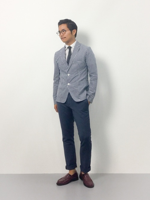ギンガムチェック柄のジャケットが目を引くネイビーパンツのジャケパンコーデです。スッキリしたシルエットのジャケットと足元にはローファーを合わせることによってスタイリッシュな雰囲気に仕上がっています。