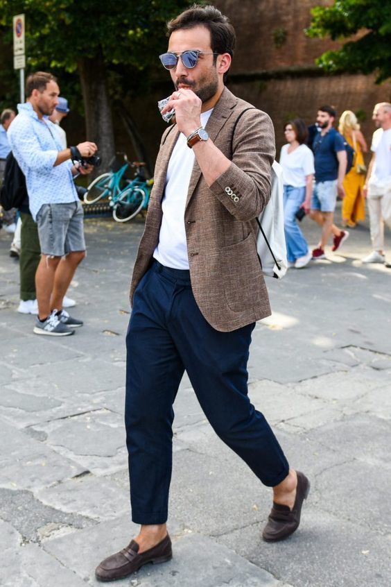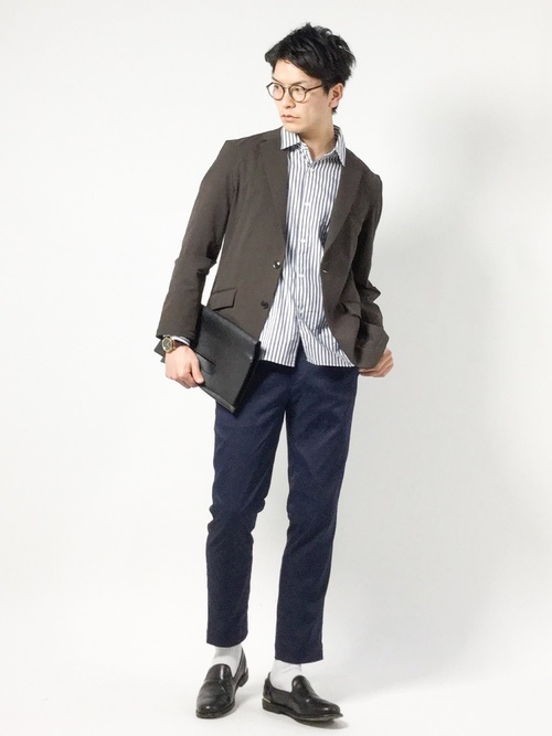 ネイビーパンツにブラウンのテーラージャケットを合わせたコーデです。インナーに取り入れたストライプのシャツをタックアウトさせることで、抜け感のある着こなしになっています。タックアウトさせる場合は丈が長すぎないシャツを選ぶのがおすすめです。