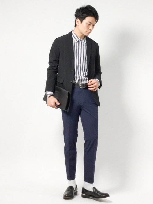ネイビーパンツに黒のジャケットを合わせてシックな雰囲気でまとめたコーデです。ストライプシャツをタックインすることで、ビジネスシーンでも通用する落ち着いた着こなしになっています。太めのストライプ柄を合わせることで、コーデにメリハリが出るのでおすすめです。