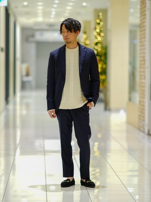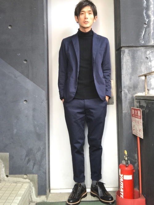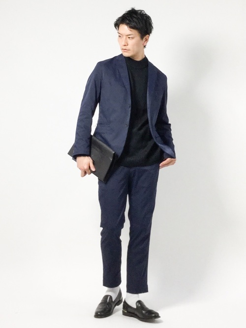 ネイビーのパンツとジャケットに黒のインナーを合わせたシックなコーデです。全体的に暗めの印象ですがホワイトの靴下が差し色になってメリハリが出ています。暗めの色でまとめるときは、モックネックもしくはタートルなどでなるべく肌の露出を押さえると洗練された着こなしになります。