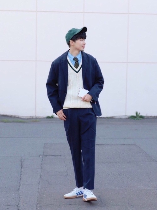 ネイビーのセットアップを使ったジャケパンコーデです。グリーンのキャップとブルーのシャツを合わせてうまく色を取り入れながら、白のニットとスニーカーがうまく全体の印象をまとめてくれています。