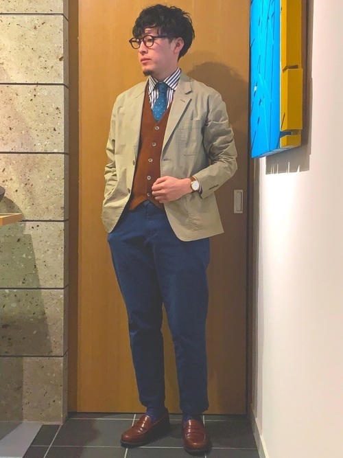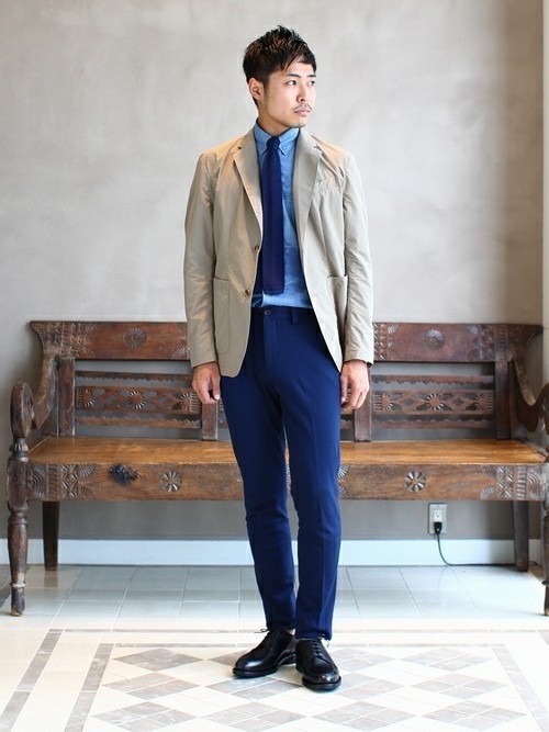 ブルーをメインとしたコーデにベージュのジャケットがアクセントになっていて、ビジネスシーンで通用する清潔感のある着こなしです。首元に合わせたニットタイはカジュアルでもドレスでも使えるアイテムで、コーデのアクセントとして目を引きます。