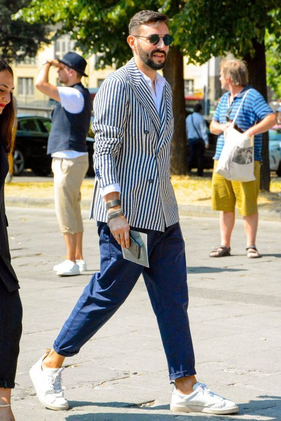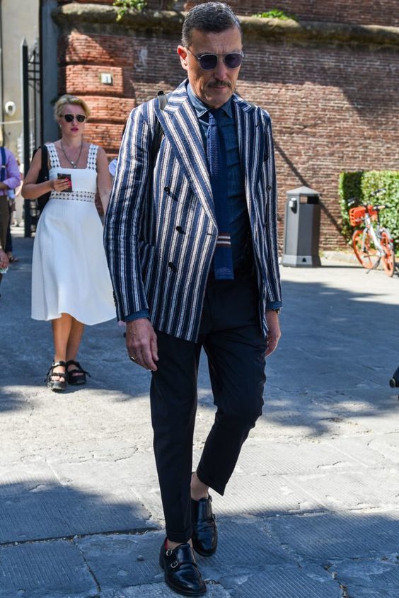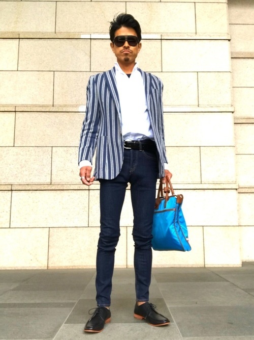 ネイビーパンツに太めのストライプのジャケットを合わせたコーデです。ライトブルーのバッグを小物として取り入れてアクセントを入れているのがポイントです。ベルトと靴は黒で合わせて、コーデ全体を引き締めています。