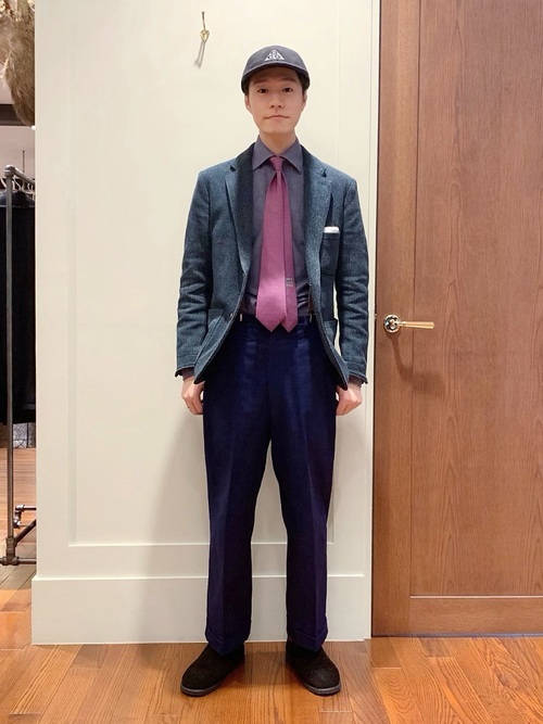ネイビーパンツとインディゴブルーのジャケットの組み合わせに、ピンクのネクタイを差し色で入れています。キャップをかぶってコーデをカジュアルダウンさせているところも上級者のテクニックです。落ち着いた色でまとめた中に明るい色の差し色を入れるとこなれ感とともに華やかさも出るのでおすすめです。