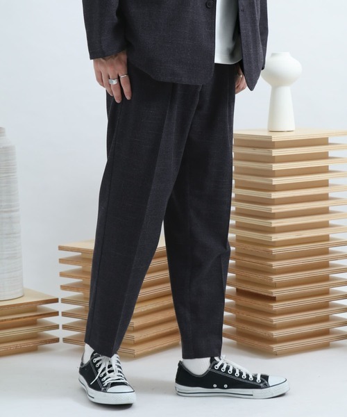 シャツやジャケットと合わせる大人なコーデに似合うナローシルエットのパンツ。こちらもセットアップでの着用もおすすめです。ウエストは後ろがゴムになっていて、ゆったりカジュアルな着こなしも可能。もちろん綺麗目に着こなしたい時はタックイン&ベルト着用でゴム部分も隠すことができます。