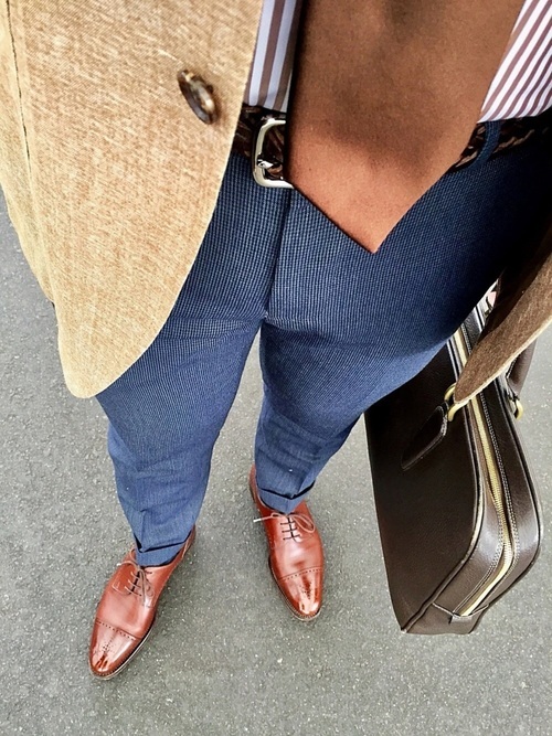 ネイビーパンツ×ストライプシャツ×ダークブラウン