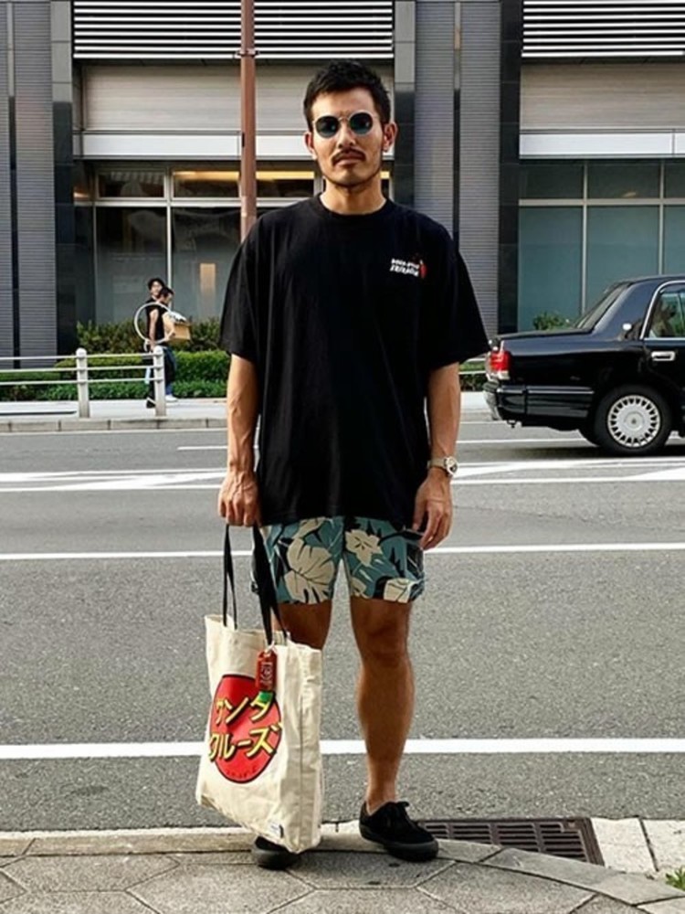 こちらはボタニカル柄のボードショーツにシンプルな単色のTシャツを合わせたコーデです。ボタニカル柄は夏感のあるデザインでサマーコーデに1枚持っていると便利ですね。柄が派手でもシンプルな黒単色のTシャツと合わせると大人の男性コーデになります。