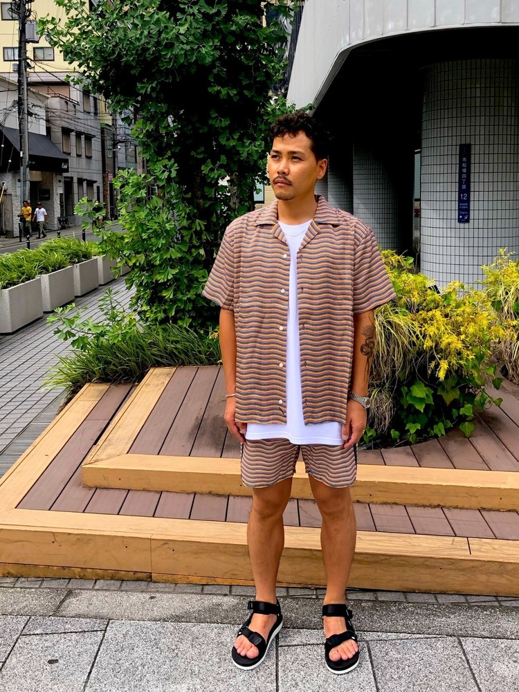 こちらはボードショーツと羽織もののセットアップスタイルです。インナーにロングシャツを着こなし、少し羽織から出すことでラフに、オシャレに着こなすことができます。セットアップで統一感のある、大人コーデが仕上がります。暑い夏でも最適なコーデですね。