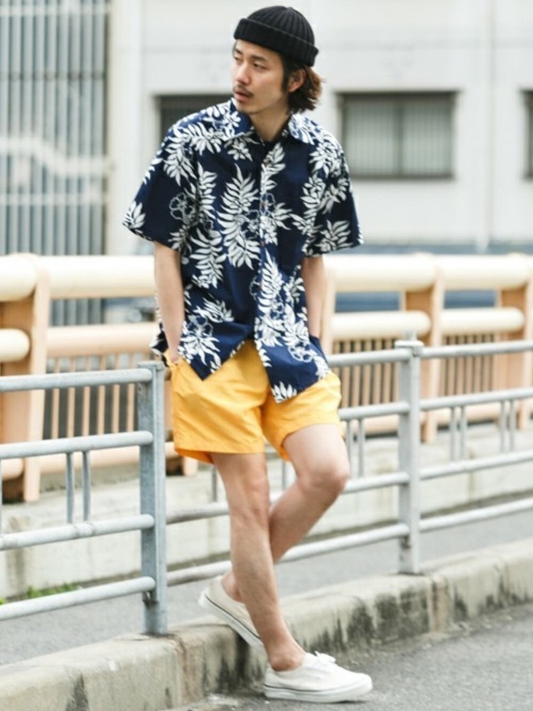 こちらはアロハシャツのボードショーツを合わせたコーデ。柄の派手なアロハシャツにシンプルなボードショーツを合わせることで夏らしく落ち着きのあるコーデに。アウトドアから街履きまでどんなシーンまで使えるアロハシャツは1枚持っていると便利ですね。ニット帽とも合わせているのがアクセントがありオシャレポイントですね。
